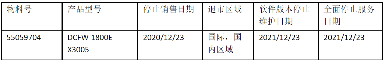 北京神州数码BB贝博艾弗森信息技术有限公司正式通知您, 以上DCFW-1800E-X3005下一代防火墙(55059704)将于20201223号停止接收新的订单(具体日期见上表),不再供货。给您带来的不便,敬请原谅。